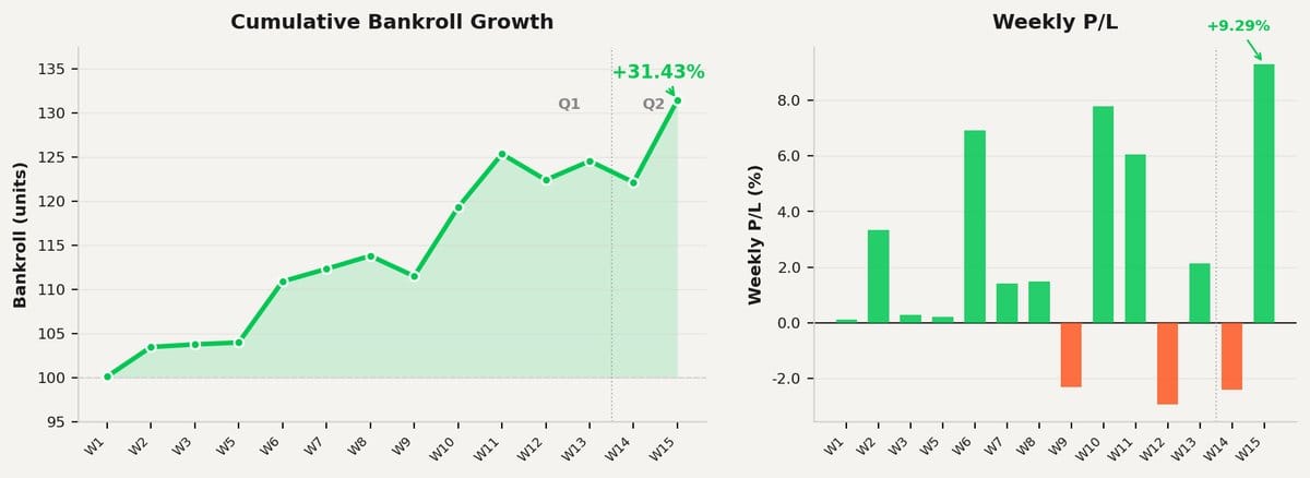 +31.43% YTD BANKROLL | +6.89% Q2 2026 | 62% SEASON CLV | 12 / 15 WIN WEEKS |